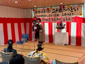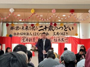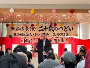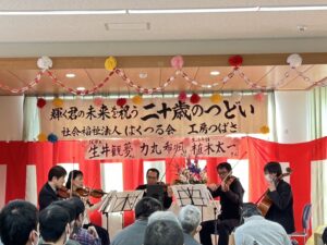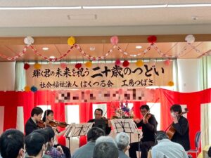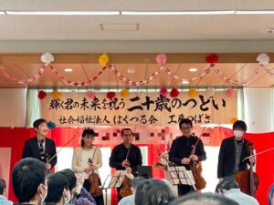二十歳のつどいを開催しました!1月24日、二十歳を迎える利用者さんのお祝いを開催しました! 今年は就労系から2名、生活介護から1名の方が二十歳を迎え、下野市市議会副議長の貝木幸男様がお祝いにかけつけてくださいました。 また、今年はル・シュヴィエ四重奏の皆様による素敵な弦楽器の演奏(リクエストの「星空のディスタンス」は五重奏で演奏していただきました!)と、お馴染みの腹話術のけんちゃんもお祝いの会を盛り上げてくださいました♪ 二十歳おめでとうございます。 お祝いしてくださった皆様ありがとうございました。
